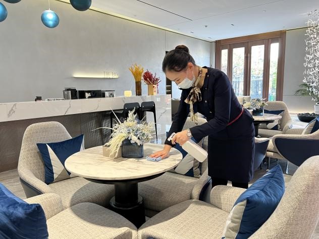 一客一消,守護(hù)安全:客人離開(kāi)后須對(duì)落座區(qū)域進(jìn)行消毒。洽談桌、樣板間、洗手間等所有空間堅(jiān)持一客一消毒。
