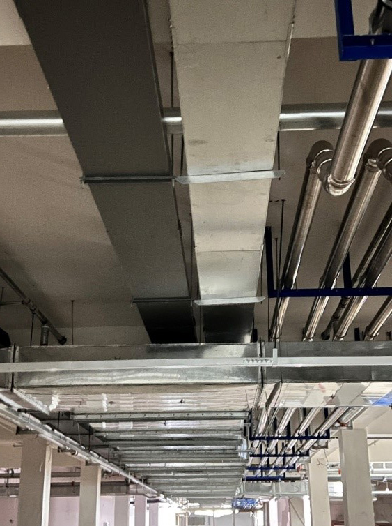 二是最大化保證凈高。最大化保留凈高尺度,提升地下空間的開敞體驗感。主要做法:首先是將主管道貼梁設(shè)置,其次是消防噴淋等支管采用梁上預埋套管穿梁設(shè)置,在局部梁截面較大位置采用結(jié)構(gòu)梁部分上翻抬高梁下凈高等的方式,對空間占用進行合理布局,確??臻g凈高達到2.6米以上。