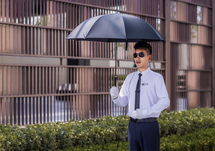 禮賓人員站姿、跨立、敬禮,每一個動作都鏗鏘有力,禮貌問詢、停車指引、遮陽服務(wù)、雨停服務(wù)等,細致周到的禮賓服務(wù)讓到來的每一位客戶都感受到賓至如歸的親切感。